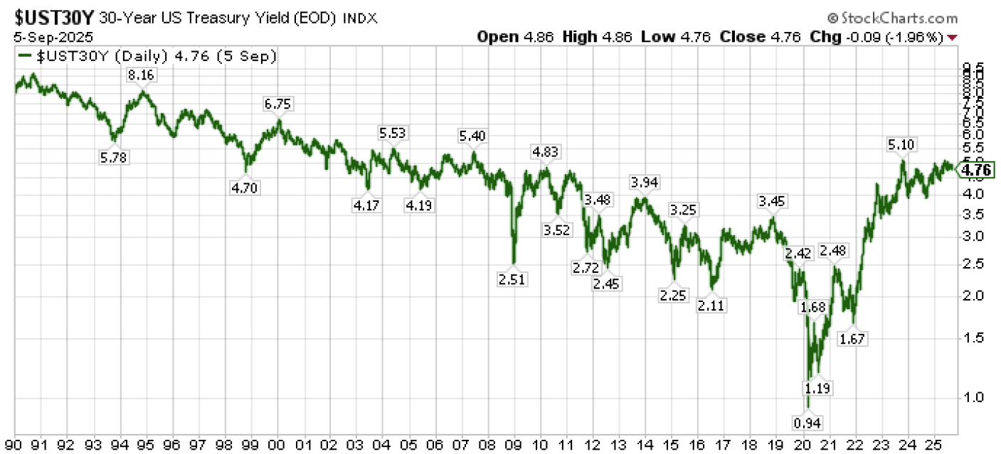So where are we today. The 30-Year U.S. Treasury yield, which reached a low of 0.94% a few years ago, is now at 4.76% and rising. It’s lurched over 5% twice over the last two years, and the trend in this long bond yield is definitively higher.