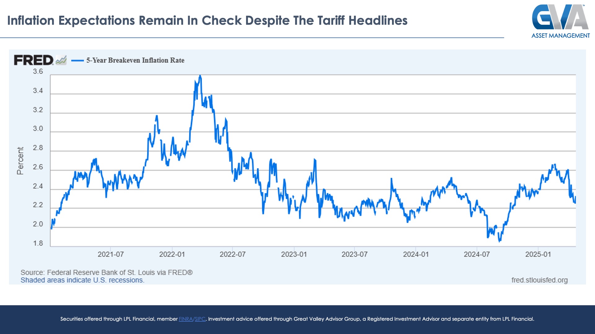 What about inflation?  The financial news headlines, after all, continue to alert us on a real time basis that the associated price increases from all around the world are soon coming to our our shores at a popular retailer near you.  These price hikes may indeed come to pass, but even if they do, will they be sustained price increases?  The market itself clearly does not think so.  For unlike 2021 and 2022 when the 5-year breakeven inflation rate was picking up steam for well over a year, this same reading that estimates the projected average inflation rate for the next five years continues to languish at a very disinflationary 2.3%, down more than 30 bps from where we were before the tariffs were announced.