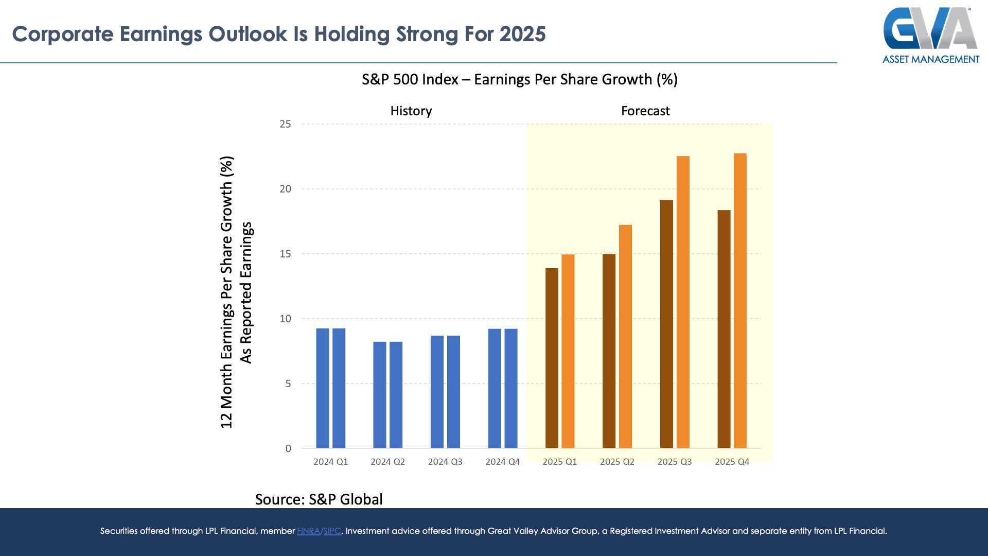 Consider the chart above showing the 2024 historical and 2025 forecasted per share corporate earnings growth on the S&P 500 Index.  We are now more than half, just over 55% to be exact, through the 2025 Q1 earnings season, and the results have been highly encouraging so far.  Have earnings growth projections coming into the quarter (dark red bars in the chart above) come down a bit through the first half of earnings season?  Sure, but it would have been extraordinary if companies hadn’t revised their outlooks lower at least somewhat given the supposedly cataclysmic uncertainty associated with the tariff rollout just over a month ago.  And the fact that corporate earnings growth is still holding in the +13% to +16% range for the rest of 2025 is decidedly encouraging (remember, we had less than 10% earnings growth throughout 2024 as shown by the blue bars in the chart above, and the U.S. stock market was up over +20% last year), as it implies that even after all of the tariff hubbub that underlying economic fundamental conditions remain strong.