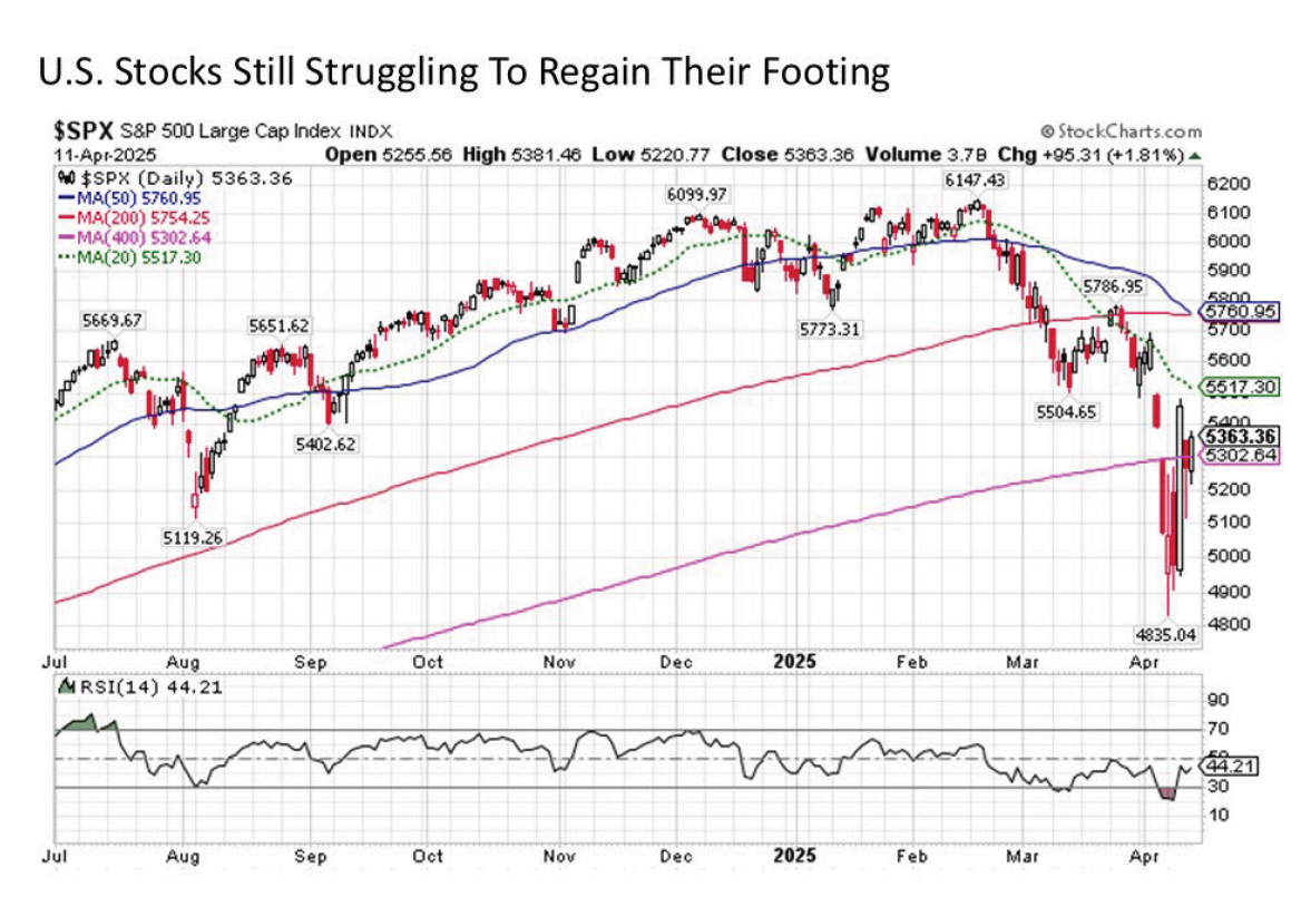 It has been a tumultuous second quarter so far. After only nine trading days, we have seen U.S. stocks as measured by the S&P 500 plunge by more than -15% peak-to-trough in the wake of the “Liberation Day” tariff announcements, only to find their footing and battle their way back since. Although the tariffs for most countries have been paused for 90 days, market volatility remains elevated and investors on edge. What is the set up for capital markets for the week ahead? And what are the implications for the longer term outlook.