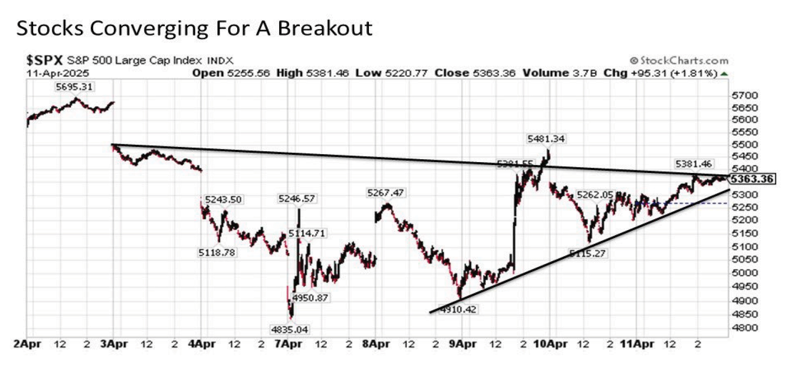 Looking closer at the intraday charts on the S&P 500 provides further support for the short-term upside breakout thesis.  Focusing on the intraday trading channel dating back to April 8 in particular (before the 90-day pause was announced), we see that stocks have been picking up momentum with notably higher lows versus only the marginal lower highs dating all the way back to April 3.  This implies that buyers are advancing far more assertively in recent trading days since sellers are likely to seek to defend in the coming trading days.  And with futures already trading solidly higher heading into the overnight into Monday’s trading, an intraday breakout appears in the cards and is a bullish way to kick off the new trading week.
