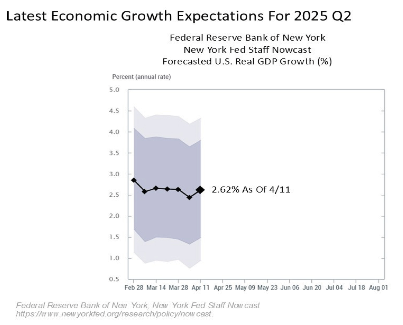 Let’s begin with the latest look at the economic forecasts.  For this, we will focus on the latest readings for U.S. GDP growth for 2025 Q2 from the New York Fed Nowcast, which will be the quarter that will start to incorporate the full brunt of the tariffs as they are implemented.  While it remains early in the data cycle, the latest forecast for GDP growth for the current quarter is 2.6% as of Friday, April 11.  While this number could still change quite a bit over the coming months, this latest reading remains rock solid.