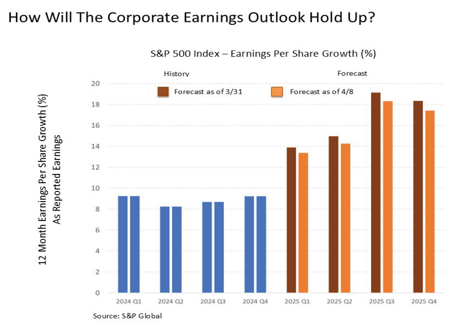 What about the latest on corporate earnings, which are driven by GDP growth and are a primary determinant of stock market returns?  The latest forecast is in through April 8 with the first few companies having reported their earnings and their outlook.  We have already seen some deterioration in the earnings forecast for the remainder of 2025, which is expected, but nonetheless the earnings forecast remains robust.  How much of this collective expected earnings growth the S&P 500 will be able to sustain in the coming weeks remains to be seen, but the good news remains that we are starting from a high bar.
