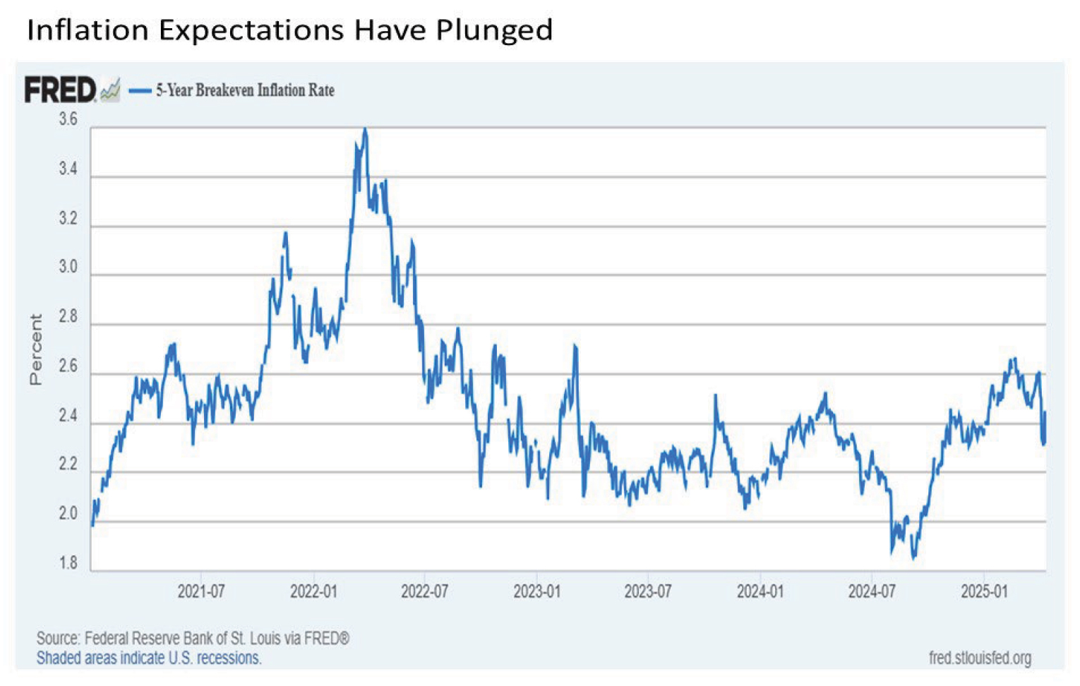 Arguably just as important is the inflation outlook, particularly since tariffs are widely and rightfully regarded as inflationary.  Despite all of the headlines about “inflation” and “stagflation”, the market continues to price in a decidedly different outlook on the inflation front.  After ending last quarter at 2.61%, the 5-year breakeven inflation rate that measures expected average inflation over the next five years has plunged in the wake of the tariff announcements and have remained low at 2.33% through Friday.  Put simply, a near 30 bps drop in five-year inflation expectations signals a market much more worried on the margins about disinflationary/deflationary economic recession in the second half of 2025, not looming inflation or stagflation.  And this implies continued flexibility for a potential Fed surprise of more accommodative monetary policy in the form of interest rate cuts in the months ahead.  The market is already pricing in a quarter point rate cut by June and three quarter point cuts by December.