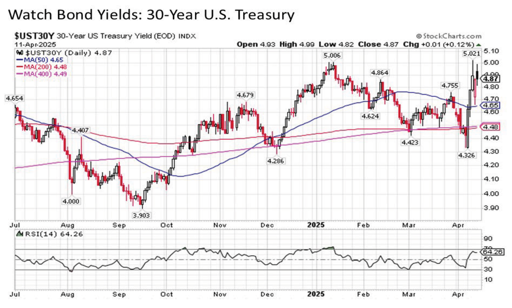 Of course, the arguably more important story that merits watching not only for the short-term but for the intermediate-term and long-term through the remainder of the year and beyond is the bond market. After all, it was the dramatic surge in Treasury yields including the 10-Year from below 3.9% during the overnight heading into Monday’s trading last week to over 4.5% by Wednesday coupled with the precipitous drop in the U.S. dollar was the very likely catalyst for the 90-day pause (forget about trade wars – a swift capital flight out of the U.S. evaporating Treasury market liquidity while sending borrowing costs soaring and the dollar precipitously declining is an effective way to tame the U.S. tariff impulse really fast). Yields moved relentlessly and sharply higher all last week, and it will be important to watch to see if this recent surge starts to level out to start the new trading week.