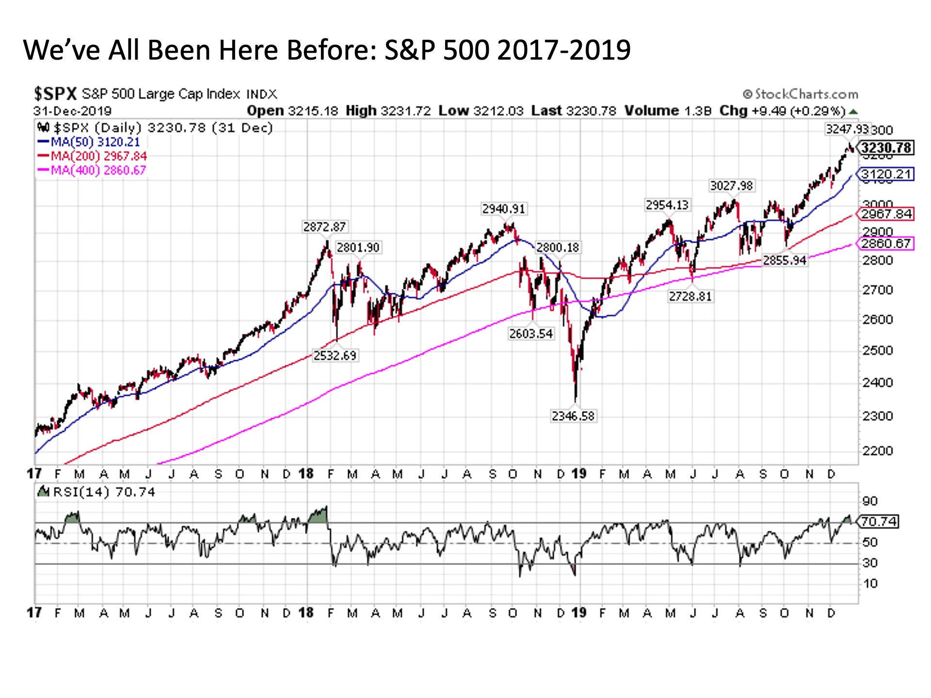 Already seen.  As alluded to above, history is a useful guide in understanding what to expect from the stock market going forward.  Of course, this is not the first time we have been confronted with potential bad news and raging financial newsflow on a daily if not hourly (if not continuous) basis.  Let’s reflect back only a few years ago when we had similar executive leadership in the United States.  The chart below shows the S&P 500 Index over the period from 2017 to 2019.