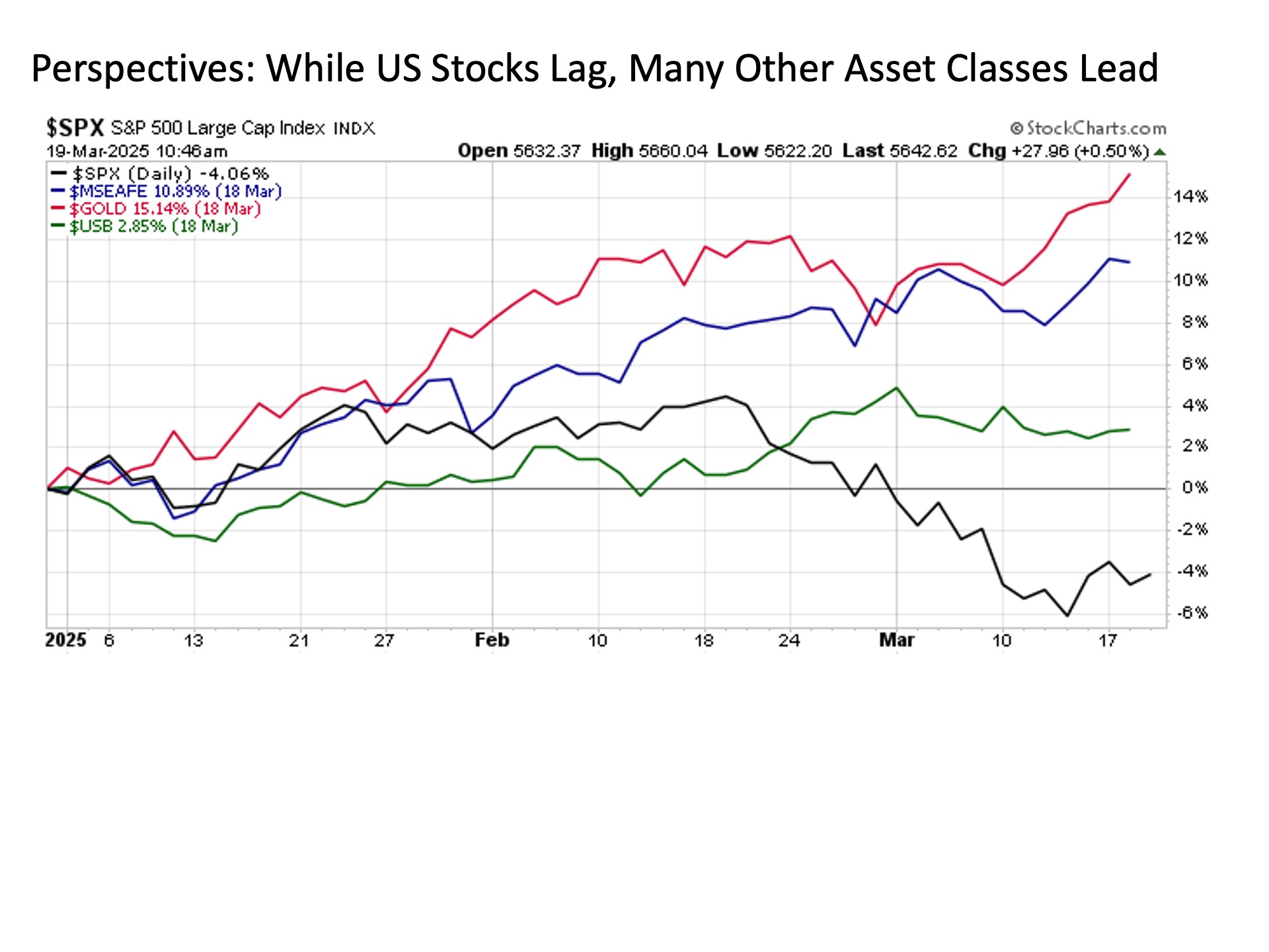 Consider the current market environment.  While the U.S. stock market is lower so far in 2025 following its recent -10% decline over the last four weeks, long forgotten developed international stocks are higher by more than +10% year to date.  Precious metals?  Gold is higher by +15%.  Bonds? Treasuries are higher by +3% on price alone not counting the yield.  All good stuff in a market where U.S. stocks are falling for the first time in a long while.