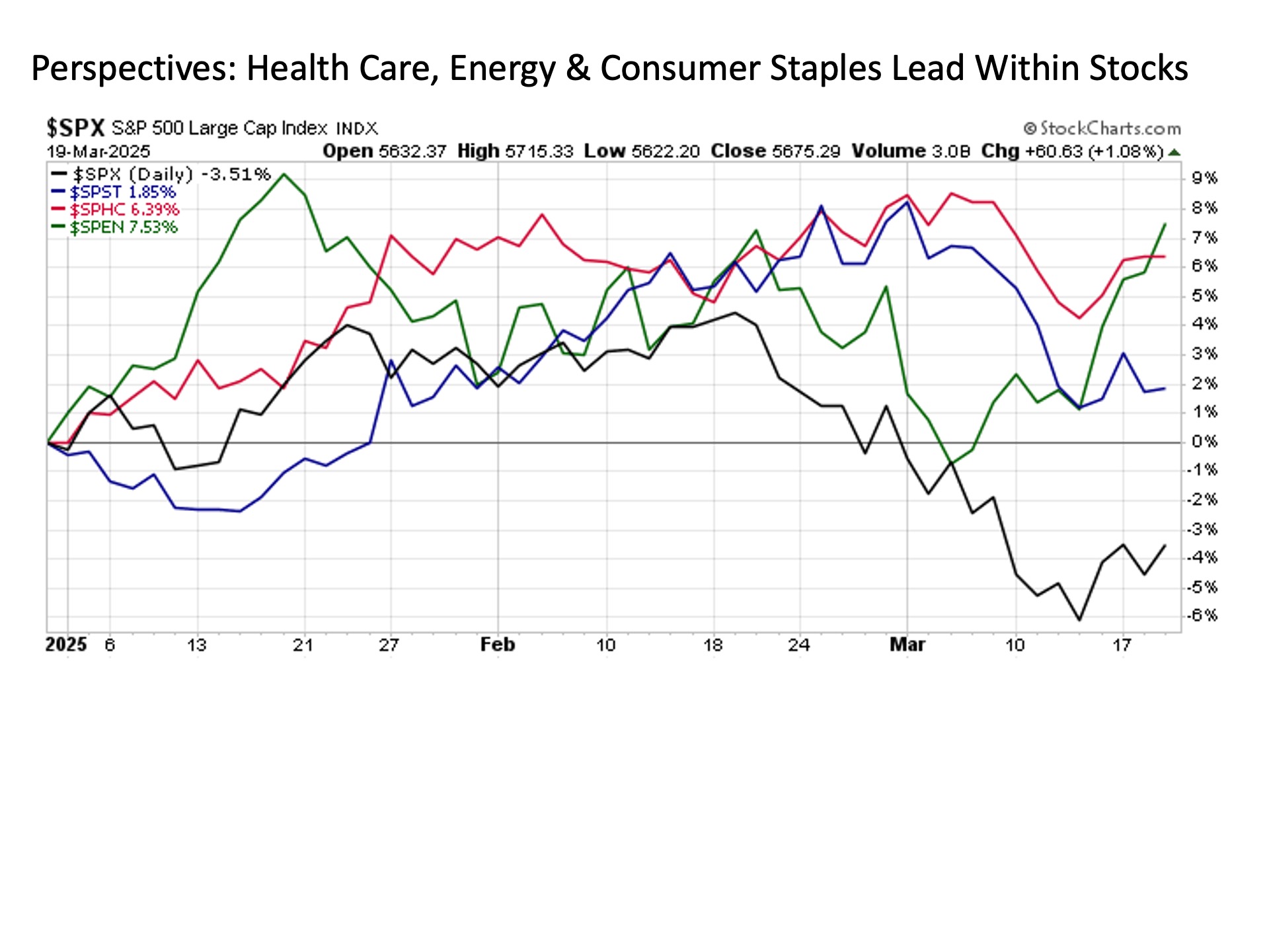 What about within the stock market itself?  Similar to what we saw a quarter of a century ago, today’s TMT in general and the Magnificent 7 in particular are leading to the downside.  But outside of two trailing sectors that had done so remarkably well over the past eighteen months previously, we see that many other major market sectors are doing well.  This includes health care, energy, and consumer staples, each of which are solidly higher so far in 2025.