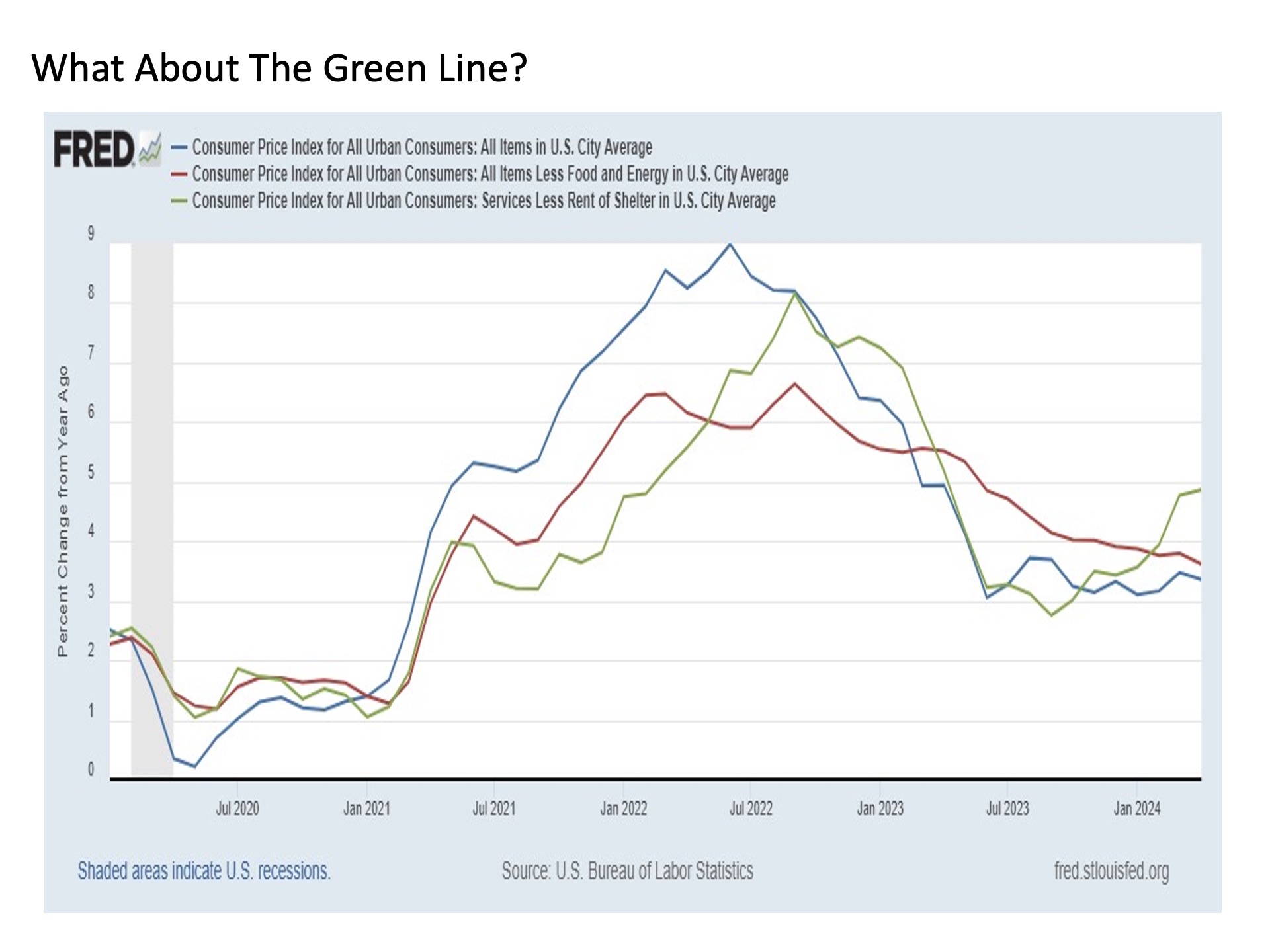 The green line in the chart above is the inflation rate for services in the U.S. economy outside of the cost to own or rent a place to live.  Think services like your water and trash collection bills, your doctor bills, your car insurance, your vet bills, and the cost for movie and sporting event tickets among many others.  In short, it’s all the things we spend our money on each month in the course of living (and hopefully enjoying) our day to day lives.  This services ex shelter inflation rate had been falling since 2022 even faster than the headline readings reaching a low of just 2.8% by last September.  But since the end of 2023 and through 2024 so far, this services ex shelter inflation rate fire has roared back to life.  As of the latest reading for April 2024, it’s closing in on 5%.  Hot, hot, hot!!!