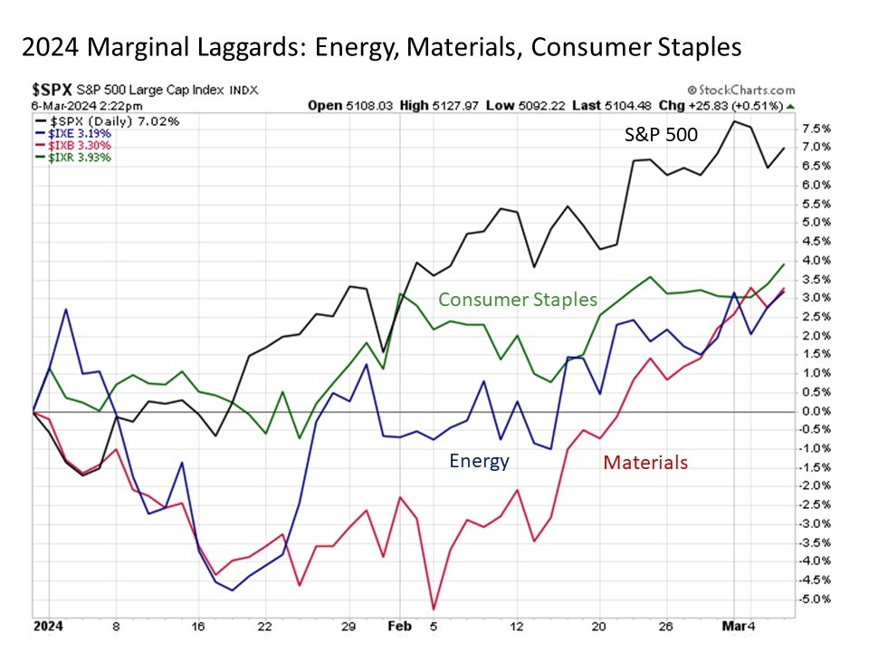 Let’s start with the marginal laggards. This includes energy, materials, and consumer staples, each of which are up between +3.8% to +4.5% year to date.