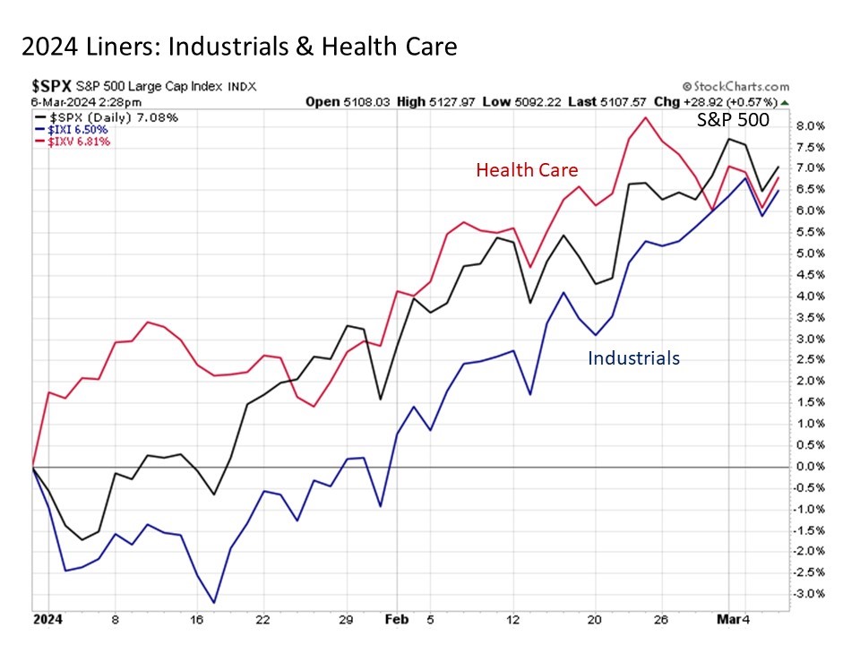 Next up in the in line group are health care and industrials, both of which are only slightly below the S&P 500 returns for 2024 but have been tracking closely along the way.