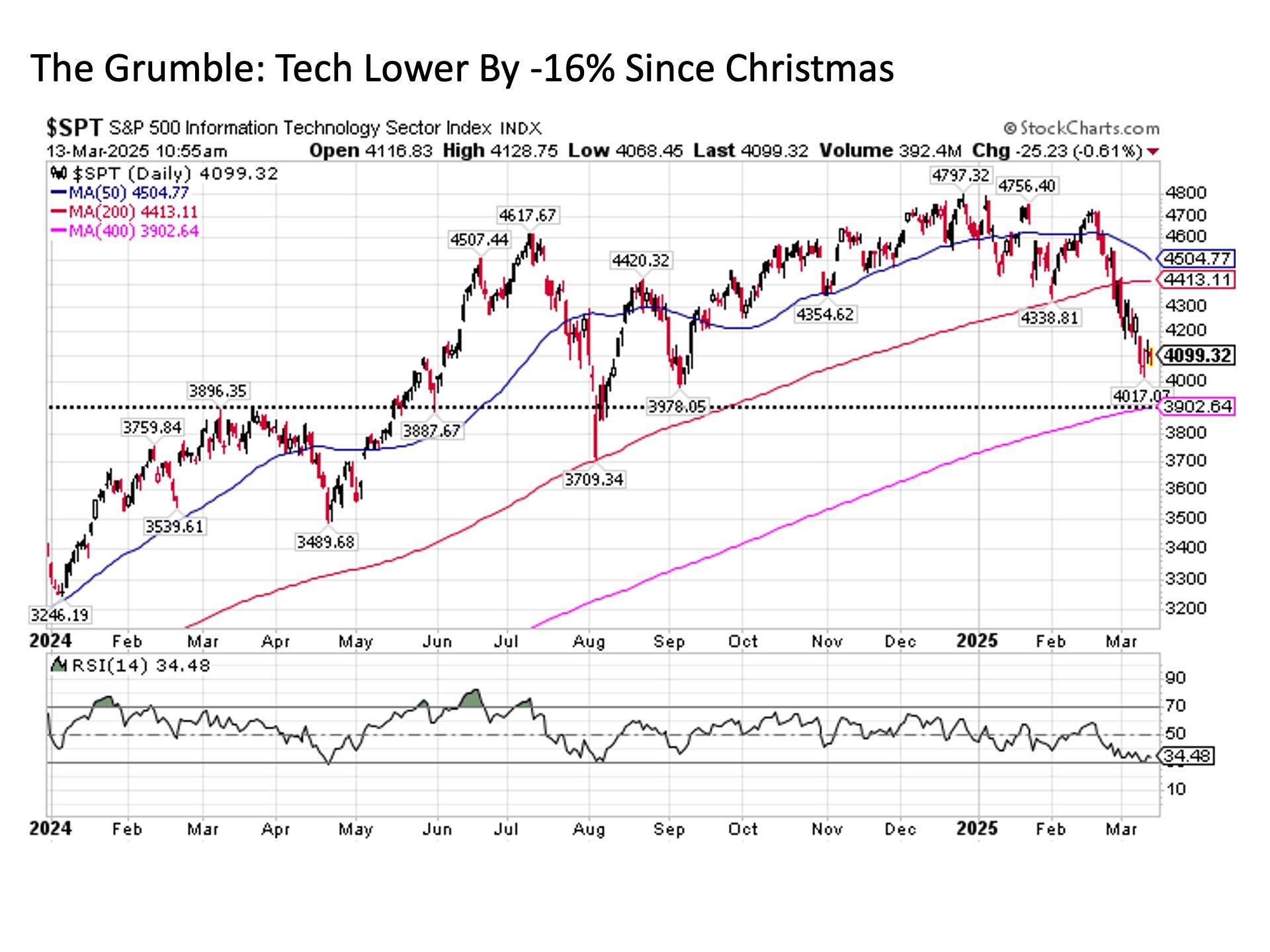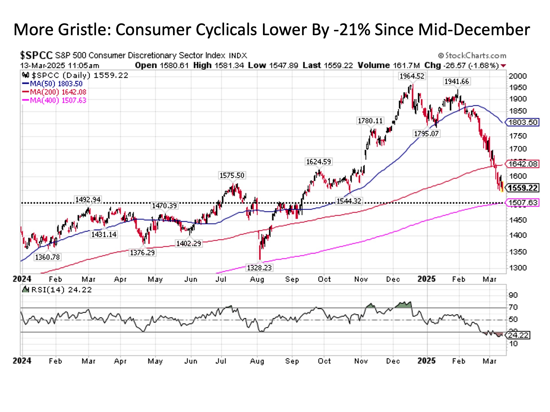 What is notable is that this tech weakness has been simmering for a few months now.  After peaking the day after Christmas at the end of 2024, the tech sector as a whole has dropped by as much as -16%.  In the process, it is now pressing toward its ultra long-term 400-day moving average support (pink line in chart above), which is still another -5% lower from where the sector is collectively trading today.  As a result, while the underlying earnings growth fundamentals remain strong for this long leading sector, we should not be surprised to see further weakness ahead in the immediate term.