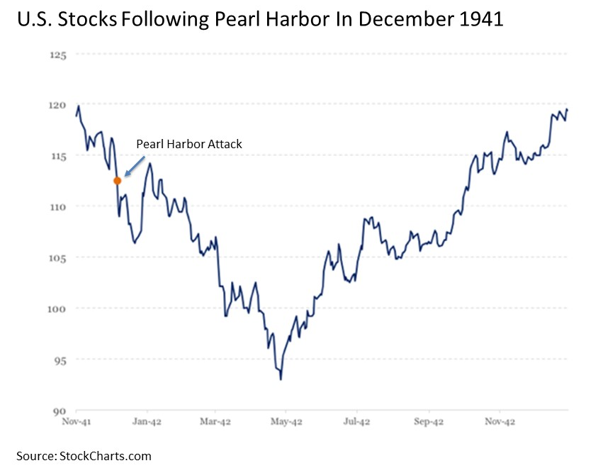 World War II. The first is the U.S. stock market reaction to the attack on Pearl Harbor on December 7, 1941, that effectively ushered the United States into World War II. The Dow Jones Industrial Average had already been declining for some time in December 1941 in the midst of the secular bear market dating back over a decade. And, while the U.S. stock market immediately dropped by more than -5% through December 23 that year, it subsequently bounced. By January 1942, stocks were +1.5% higher since Pearl Harbor. Of course, stocks subsequently rolled over in the next four months, declining a total of more than -17% through April 1942. But this late April bottom effectively represented the final secular bear market lows for U.S. stocks during the Great Depression period. For only three months later in July 1942, stocks had recovered most of their lost value since Pearl Harbor. By October 1942, they had recovered all of it. And, over the remainder of World War II, U.S. stocks steadily rose.