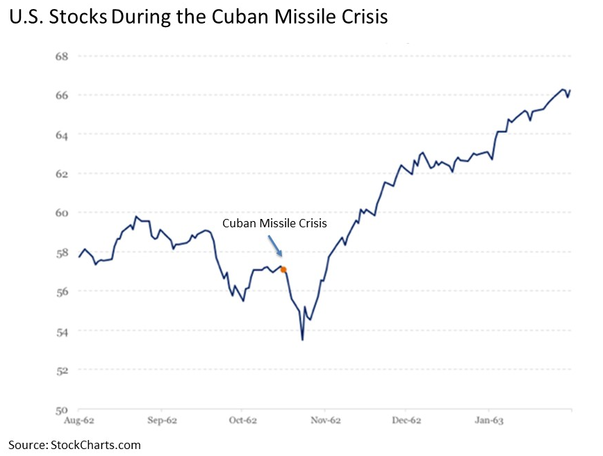 Cuban Missile Crisis. The next is the Cuban Missile Crisis, which took place over the course of 13 days from October 16 to October 28, 1962. Many historians regard this incident as the closest the world has come to the outbreak of a global nuclear war. U.S. stocks, as measured by the S&P 500 Index, immediately dropped by -7% in the first four trading days of the crisis starting on October 16, but quickly bottomed and subsequently rallied. By November 1, they had recovered all of their lost value. And, by the end of the year, they were higher by double digits.