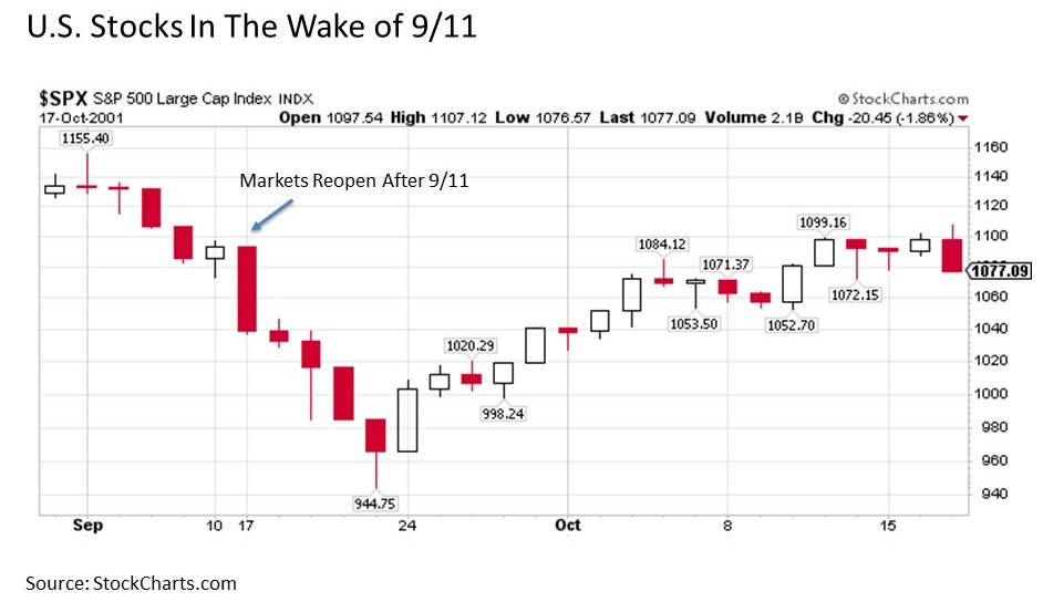 September 11. The third is the 9/11 terrorist attacks that included the collapse of the World Trade Center in New York City and the closure of the U.S. stock market for four trading days. Stocks fell by more than -8% immediately after the market reopened and proceeded to decline by as much as -15% over the next few trading days. But by September 21, stocks had bottomed. Less than a month later, they had recovered all of their lost value. And, by early December 2001, stocks were higher by more than +3% versus their pre-attack levels.