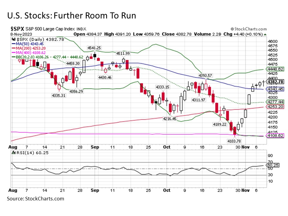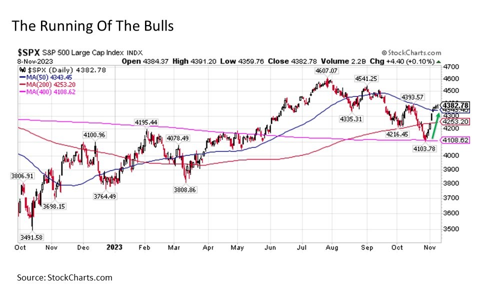 Just over a week ago, both stock and bond markets were long overdue for a bounce. And bounce they have. Just like a slingshot, the further and deeper capital markets pulled back through late October, the greater the energy released once the upside rally finally arrived. In the wake of this recent capital market burst, it is worthwhile to evaluate both where we stand today and what we can reasonably expect in the weeks ahead through the end of the year.