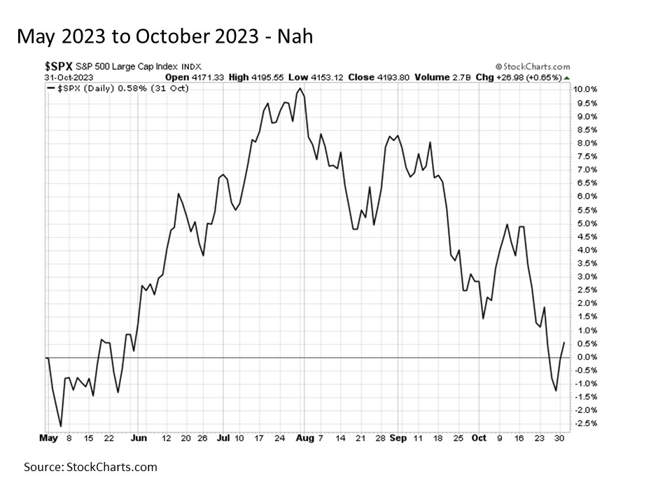 The stretch from May to October ended up a bit more turbulent, as stocks travelled up one side of the mountain and back down the other. By the end of this less favorable six month stretch, stocks ended effectively flat.
