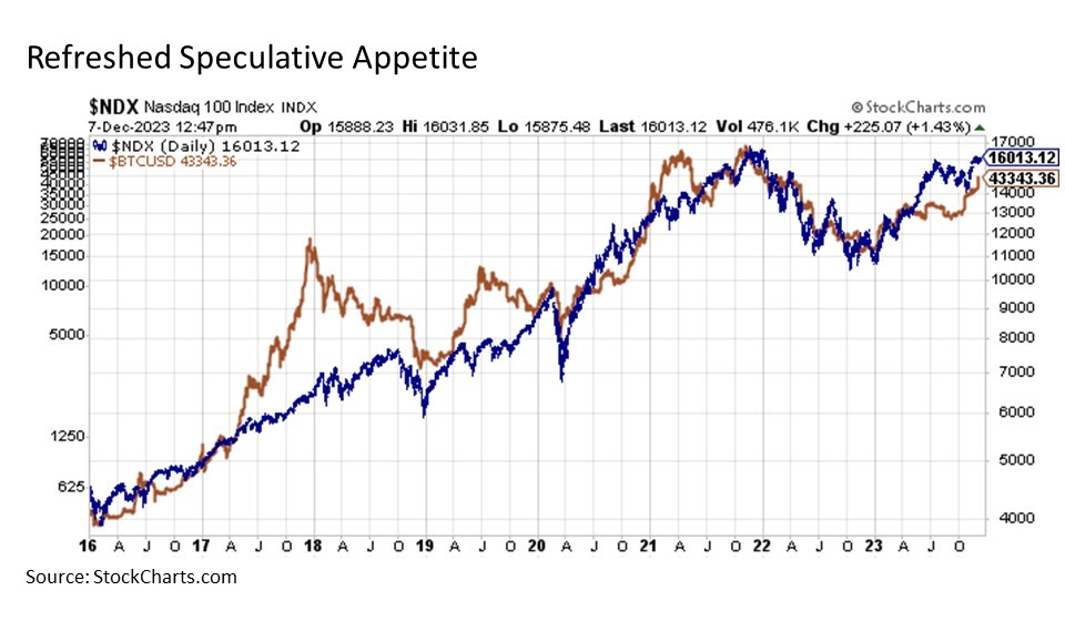 Fortunately for stock investors, the exact opposite has played out. Bitcoin prices have surged to the upside to catch up with the NASDAQ 100, supporting a continued move to the upside. And potentially more significantly from a market signaling perspective, it is worth noting that Bitcoin prices began rallying in early October, a few weeks before the stock market finally bottomed on October 30.