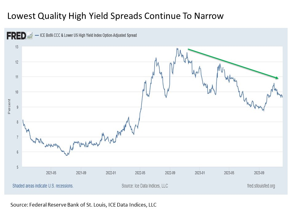 So what are we seeing today? When looking at high yield spreads, I like to focus on the CCC and lower rated space. Why? Because if investors are even starting to feel jittery about taking on risk, it is with the lowest quality securities where we will very likely see this sentiment manifest first. And over the past year, we have seen CCC and lower spread continue on a narrowing trend. Even following the recent mini spike in spreads during the August to October correction, the trend has returned to the narrowing path. These are positive developments from a speculative risk taking perspective.