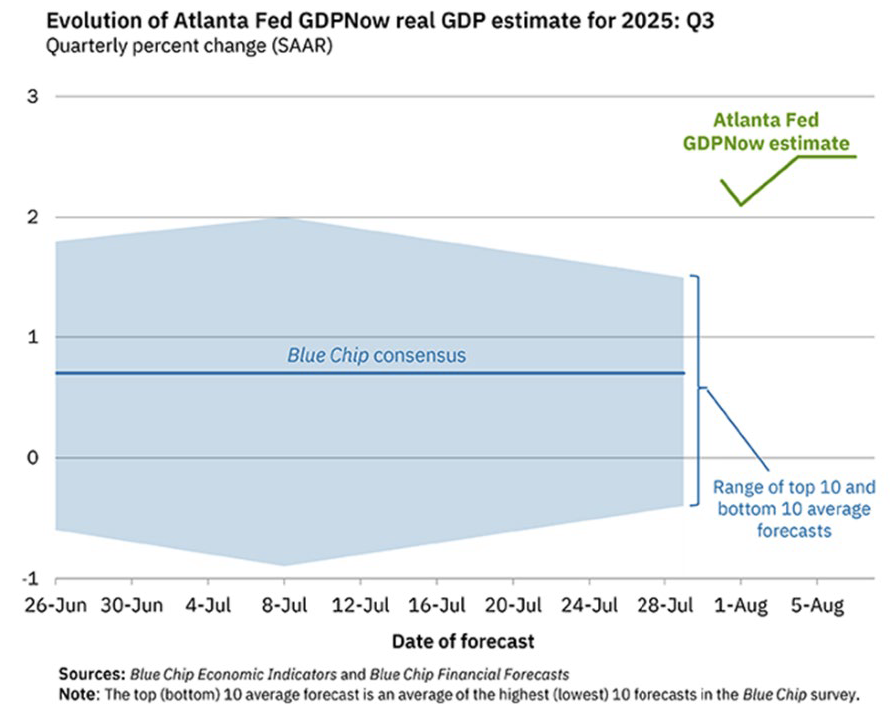Let’s dig a little deeper into the fundamentals. Keeping it clean, here is an early look at the Atlanta Fed GDPNow forecast for 2025 Q3. So fresh at +2% coming out of the gates for the current quarter based on the data, once again well ahead of more pessimistic “blue chip” economist expectations at a time when green, green from the Atlanta Fed in the chart below has been getting it right and blue from the economists has been getting it wrong.