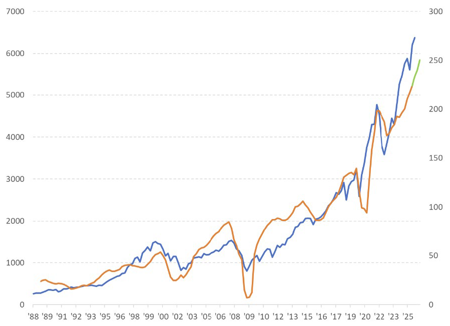 Also consider where we are relative to corporate earnings with the stock market today. Yes, earnings are rising, but the stock market as measured by the S&P 500 (blue line in chart below referencing the left axis) from a valuation perspective is running well ahead of its earnings implied price (12 month as reported earnings referencing the right axis in the chart below with the orange line being history and the green line the forecast – source for the data is once again S&P Global) at around 5200 today and 5900 at the end of the first quarter of 2026. It’s important to note that such a move would only take the S&P 500 down from an extraordinarily rich 28 times earnings to a still very rich 23 times earnings. Of course, valuations often do not matter for stocks until they do, which is around the time of an economic recession. With GDP growth projected to stay positive, this remains a worry for another day at least for now.