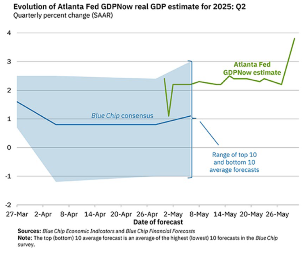 Fun With Fundamentals. It has been a tumultuous year so far for the U.S. stock market, but the outlook is improving as we head toward the middle of the year.  The much anticipated economic recession in 2025 is shaping up to be just as elusive as it was in 2022, 2023, and 2024.  One look at the latest readings for 2025 Q2 GDP according to the Atlanta Fed GDPNow forecast shows an economy that if anything is picking up steam (see that green line spike on the right below – that’s approaching +4%), not losing it.