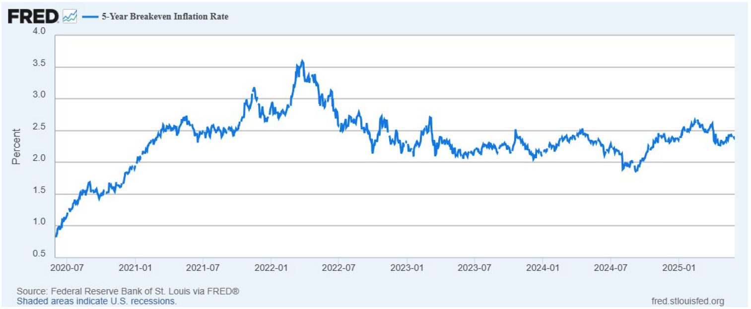 Then there is all of the understandable handwringing about the threat of inflation, particularly given the ongoing uncertainty associated with the pending tariffs being imposed on our global trading partners.  But as I enjoy my ranch water and TACOs this summer (cheeky), I’m continually reminded that inflation expectations as measured by the 5-Year Breakeven Inflation Rate (average expected inflation over the next five years as priced by the market) remains subdued at well under 2.5%.  Stay thirsty and ponder more dip buying this summer (maybe don’t hold the guac after all), my friends.