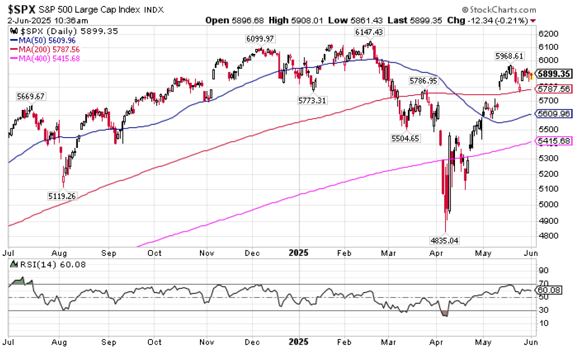 Widespread technical support for the headline benchmark S&P 500 also remains encouraging.  Following the market correction that took place from February 19 to April 7, moving average lines have reconverged (in other words, excessive froth has been wrung out of the market) and multiple key support lines have now been retested and reestablished.  Case in point – consider the recent three day cut lower in stocks at the end of the week before last amid the latest tariff chatter.  Although the “markets crashing” narrative suddenly found its way back into the financial headlines for a hot minute until last Monday came again, we see in the chart below a stock market that is very well behaved from a technical perspective.  Basically, the S&P 500 hit a short-term peak at 5968.61, fell back for three days into its 200-day moving average at around 5767 at the time (red line below), found support, and subsequently bounced higher.  This is what a technically predictable and well behaved market looks like.