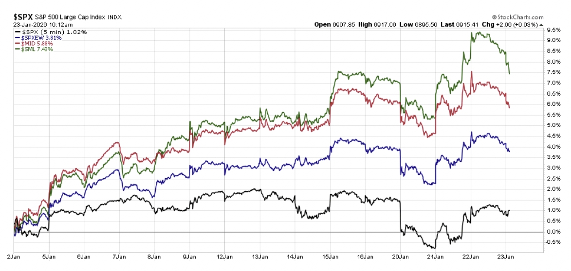 When looking at the equal weighted S&P 500 where tech ranks as the third largest sector at 13% of the index, it is already up nearly +4% YTD. U.S. mid-cap stocks as measured by the S&P 400 are doing even better at nearly +6% higher so far in 2026. What about long downtrodden publicly traded U.S. small caps that have been supposedly getting squeezed out by private equity in recent years? Surging by as much as +9% in the first fourteen trading days of the year, which equates to something like +150% annualized for the year if this continues through the rest of the year (which of course it won’t, but if markets were truly being staggered by recent geopolitical news, we wouldn’t be talking about a more economically sensitive area of the market on track for triple digit returns so far this year). With 61% of stocks within the S&P 500 outperforming the overall index so far this year, this is long anticipated broadening of market returns truly playing itself out. Not only is this highly constructive for stocks going forward, but this is not necessarily a new development, as 52% of stocks in the S&P 500 have outperformed the overall index since the start of 2025 Q4. This is broadening that is now four months in the making and coming in the context of a headline index that is continuing to press new all-time highs. Very good stuff.